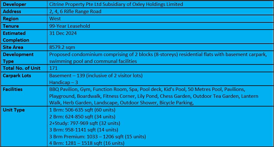 Occupying a total land area of 8579.2 sq m, Mayfair Modern will comprise of two blocks of 8 storeys each for a total of 171 homes, complete with a basement car park containing 137 resident lots, 2 visitor lots and 3 handicap lots, a 50m swimming pool, and communal facilities at Rifle Range Road. The land has a plot ratio of 1.4, among the enclave of Good Class Bungalows on Rifle Range. The units range from 1 to 4 bedroom types, with most being of the 1 bedroom type. Inspired by the buildings in Mayfair, this piece of London come to life in Singapore exhibits the unique London architecture and landscape for an exclusive living experience.